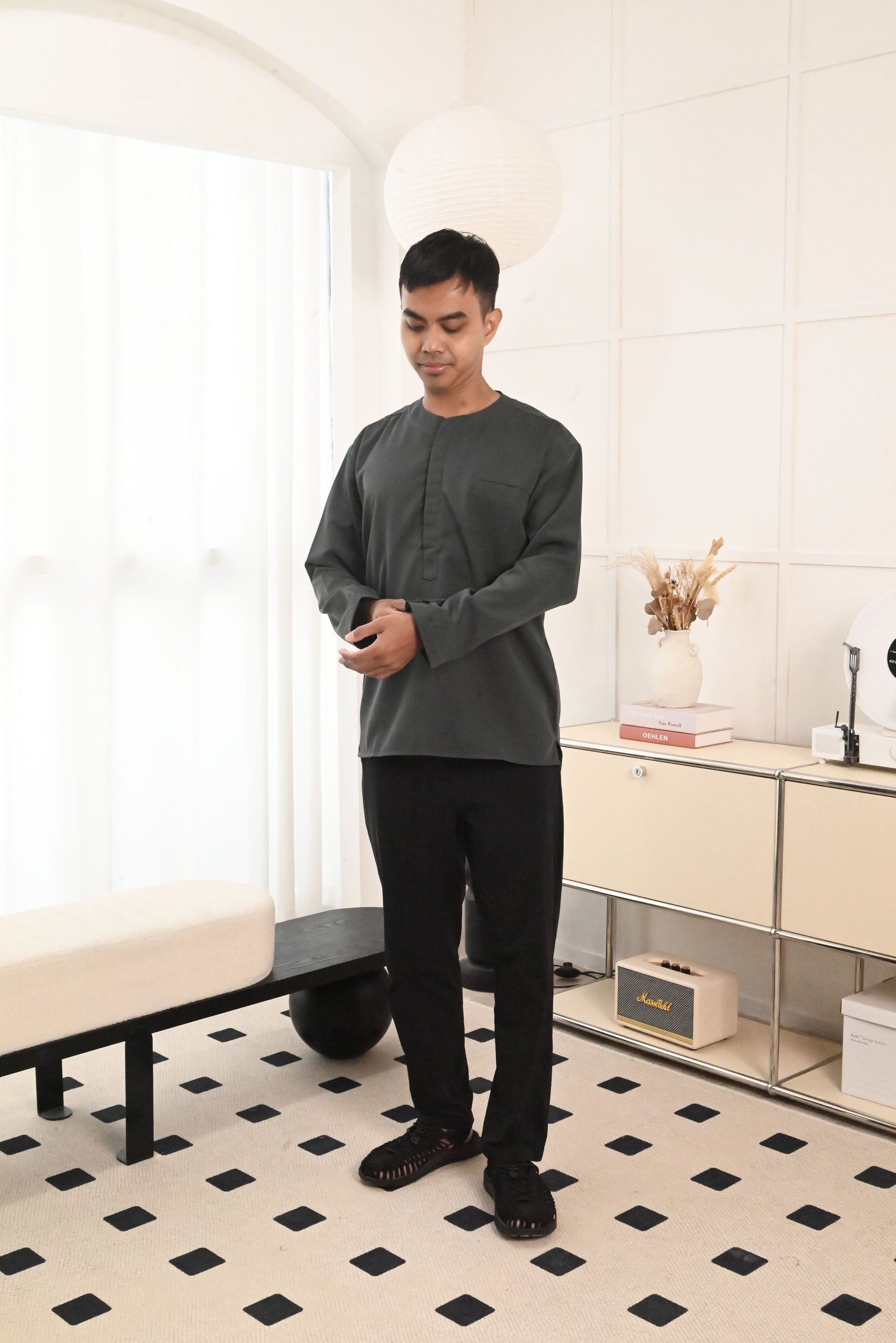 Modern Baju Melayu with mandarin collar, full sleeves and hidden buttons. Pocket on top left and both sides of top.