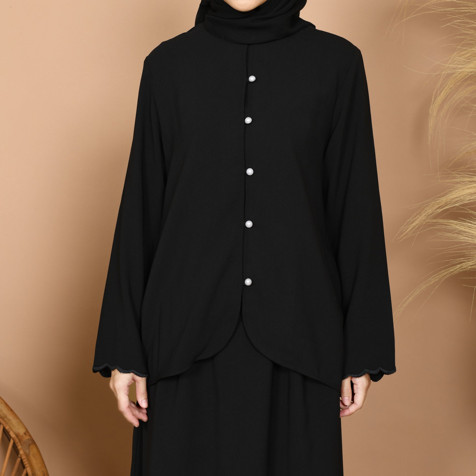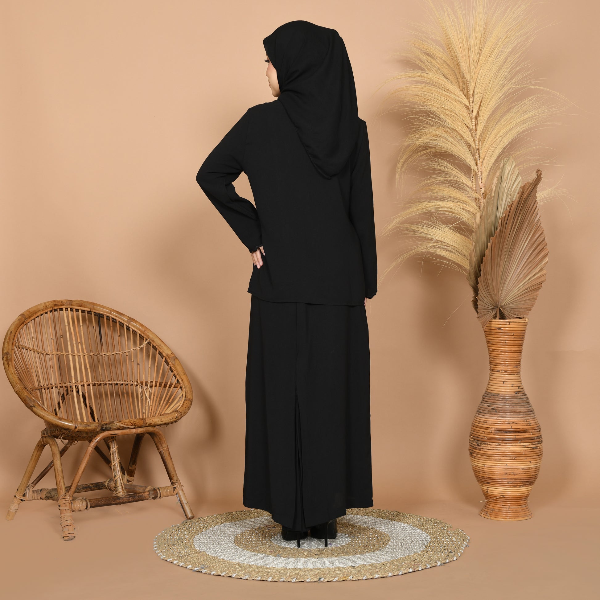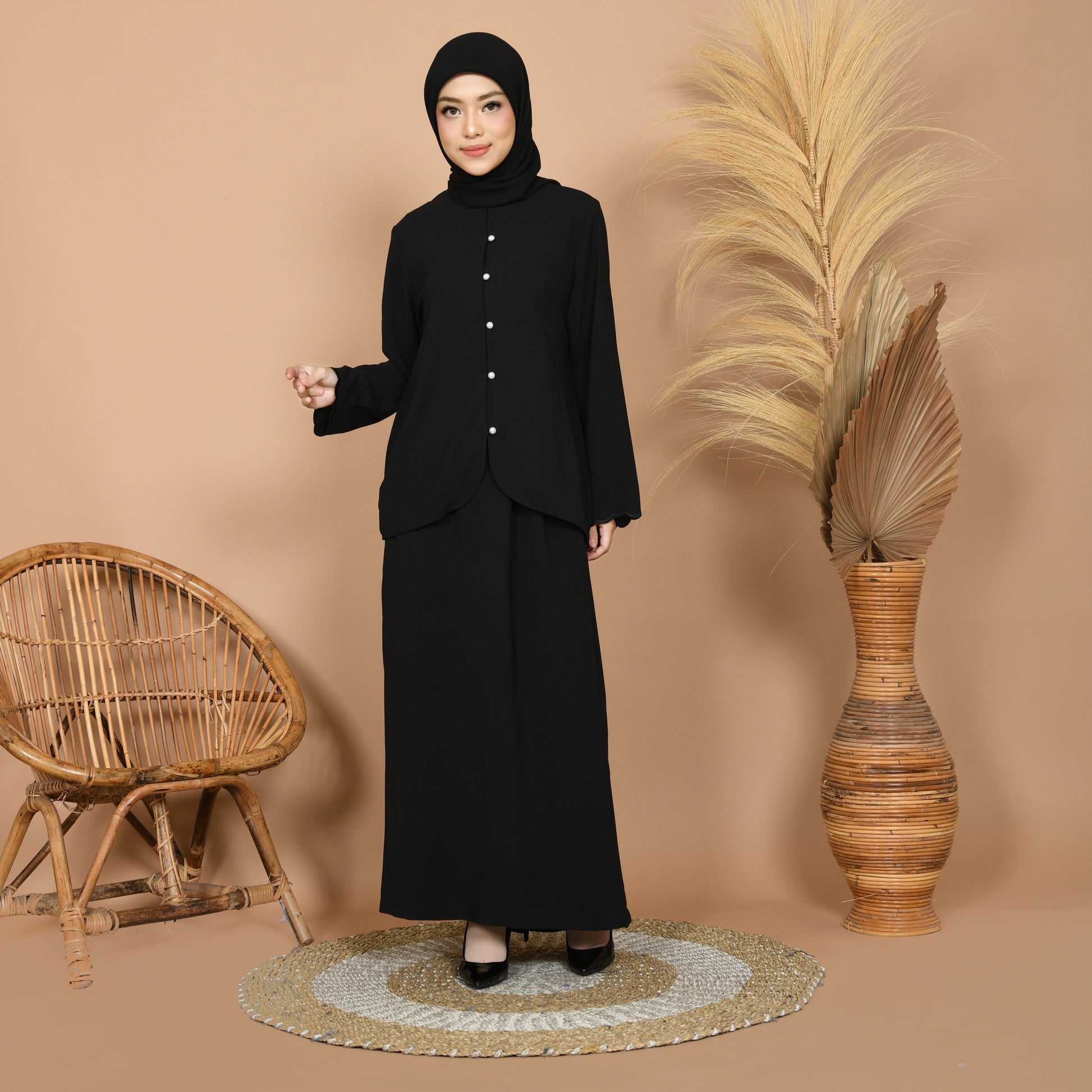 Modern Baju Kurung set with scallop sleeves and pearl buttons for that simple but modest look. Pleated slit at the back of skirt. Measurements at last picture.