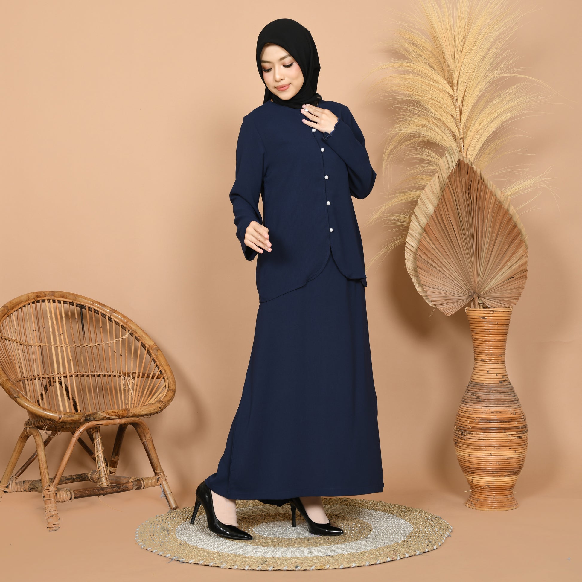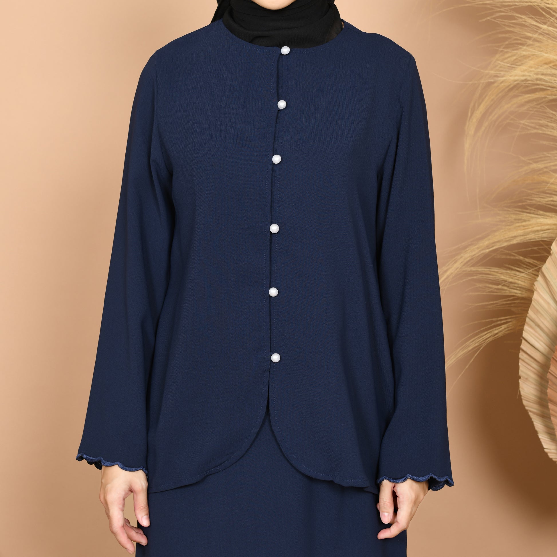 Modern Baju Kurung set with scallop sleeves and pearl buttons for that simple but modest look. Pleated slit at the back of skirt. Measurements at last picture.