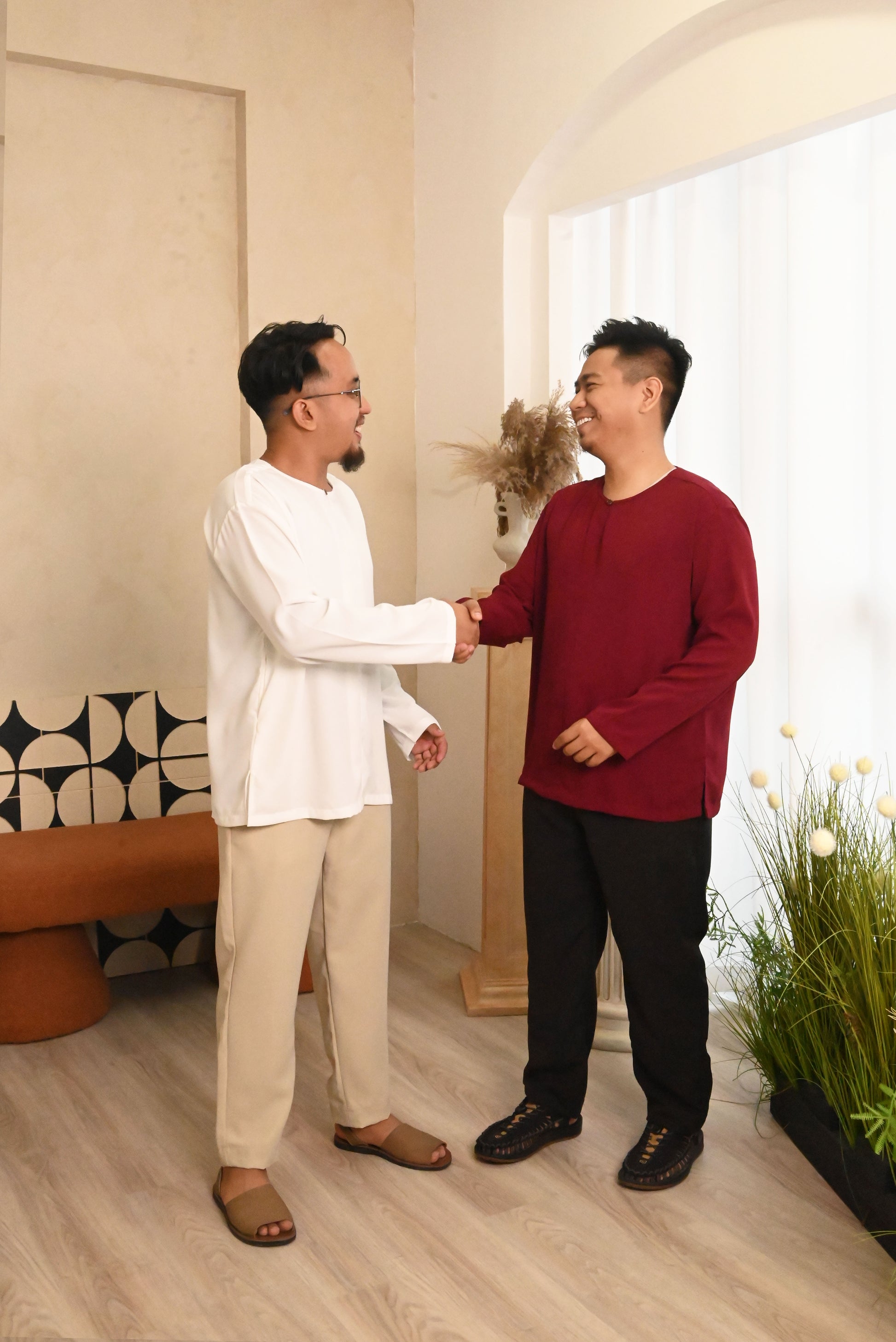 Modern Baju Melayu with a line design at the front and simple wood button for that simple yet comfortable look. Pocket on both sides of top.